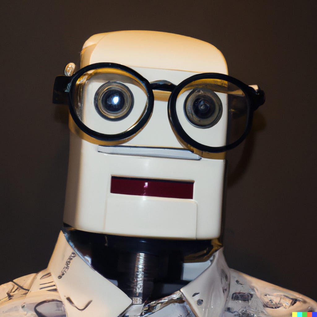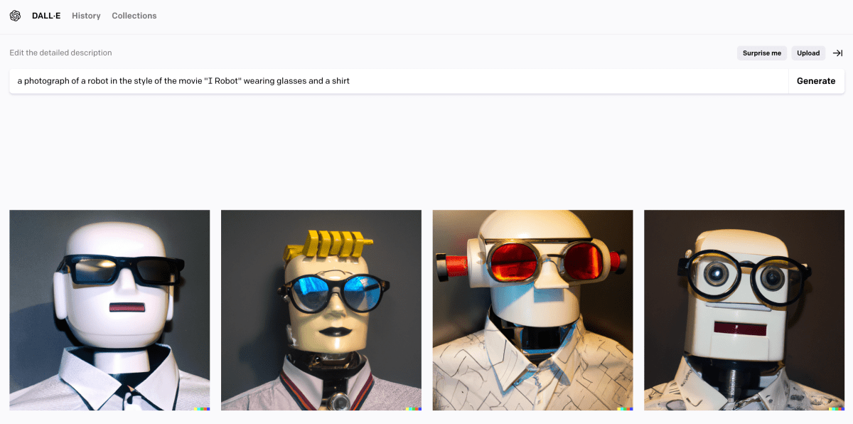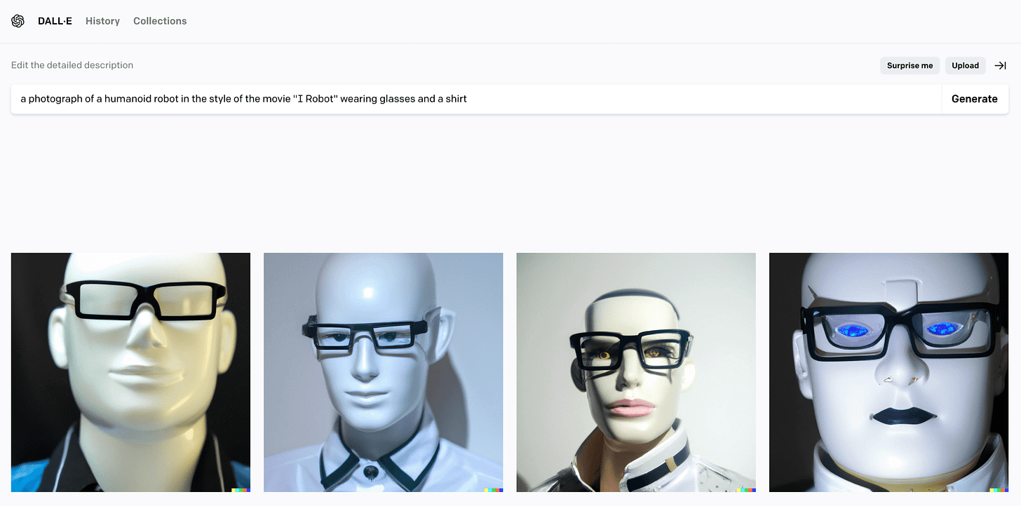 To understand the AI as intern model, consider the process of generating the illustration for this post. I called my artificial intern, i.e. opened the DALL·E 2 web app, and told it “draw me some humanoid robots with glasses and a shirt. I’m thinking of something like the movie I Robot.” The first results were disappointing and as close to the robots from I, Robot as I am to Chris Hemsworth.