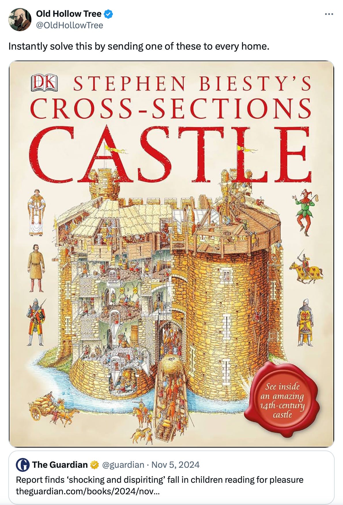 , recommending giving every child a copy of Stephen Biesty’s Cross-Sections Castle to encourage reading:Another case of “right place, right time.” My son has been interested in castles recently, building his own LEGO version after the latest session of watching Lord of the Rings together.