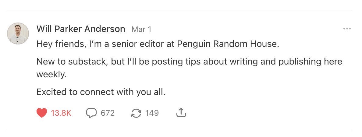 The note was nothing special: “Hey friends, I’m a senior editor at Penguin Random House. New to substack, but I’ll be posting tips about writing and publishing here weekly. Excited to connect with you all.”